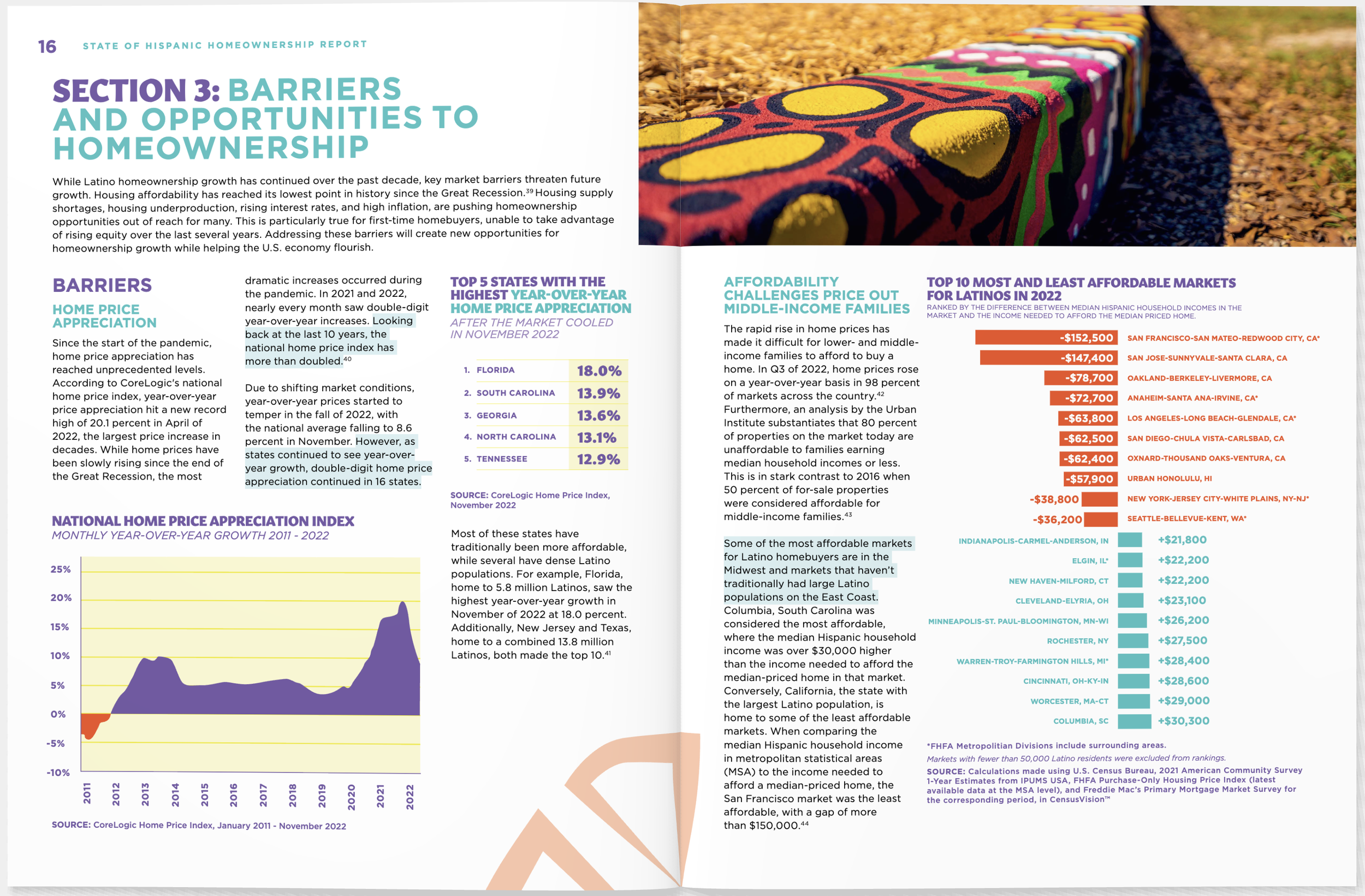 The 2022 State of Hispanic Homeownership Report pattern stems from the shapes inside of house keys. These shapes combined together as a pattern successfully emulate a Hispanic tile pattern. This idea of intersecting homeownership and Hispanic culture can be seen with the iconography and bright vibrant colors.